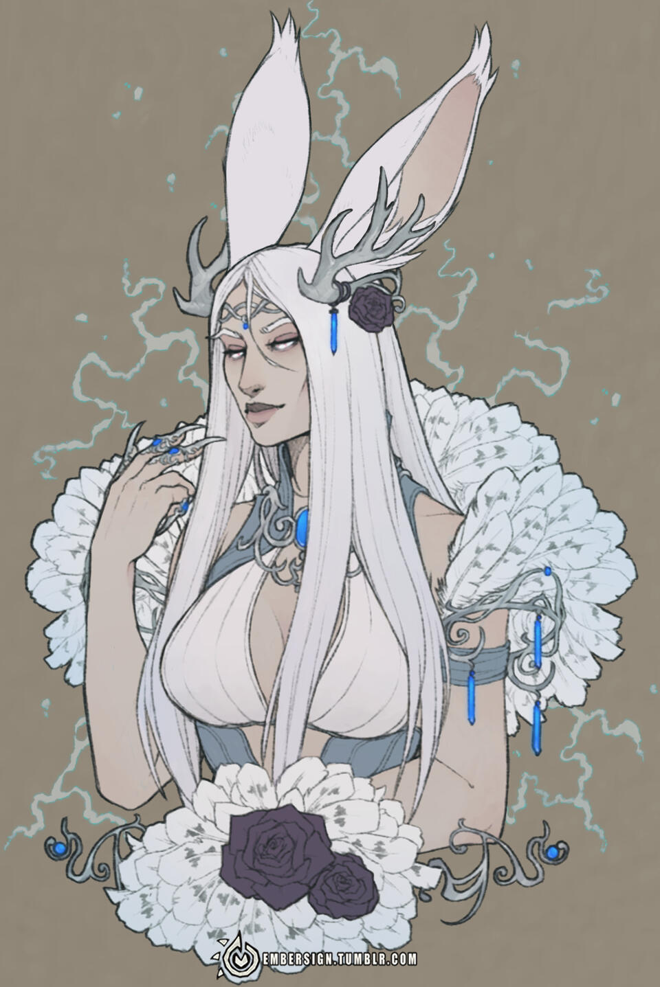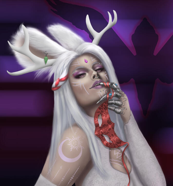 Small Antlers: The horns on her head look something more akin to velvet-covered deer horns. Rather they are decoration or actually growing from her head is anyone's guess.